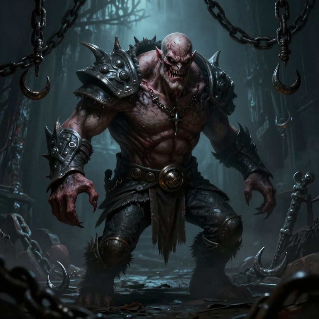 Pudge Dota 1 illustrated in epic fantasy style, heavy blood effects, massive hook weapon, swampy dark environment with twisted trees, high detail and contrast
