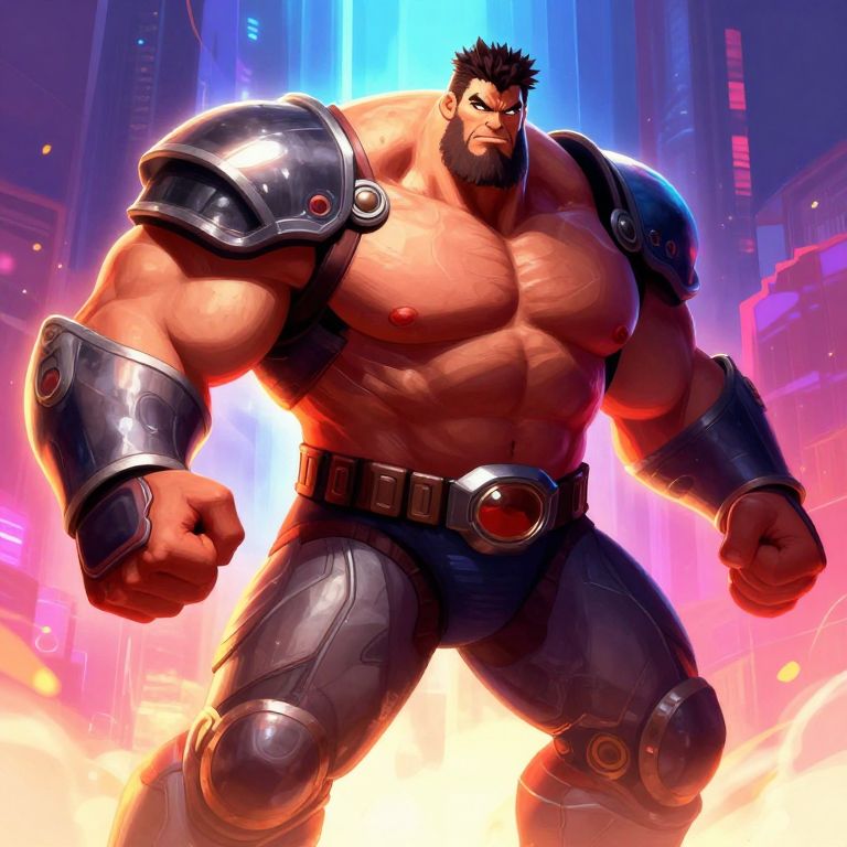 Digital art: Muscular, horned barbarian with black beard, blood-stained axe, armored shoulder plates, dark loincloth, standing in