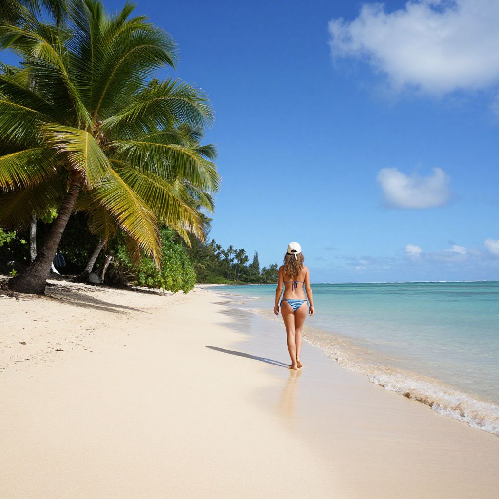 Photograph of a woman in a blue bikini and white hat walking on a sunny, palm-tree-lined tropical beach with clear blue water and white sand.