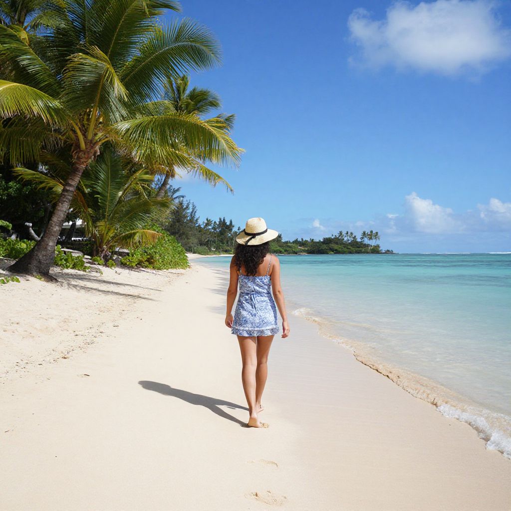 Woman walking along a pristine sandy beach in Papeete, Tahiti, with lush green palm trees to her left and turquoise waters gently lapping against the shore under a bright blue sky.