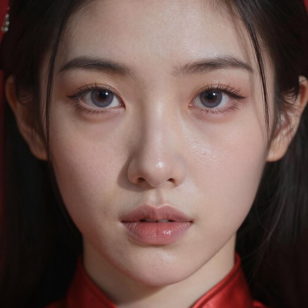A photo of a emmsto, ultra detailed, skin pores, red knight armor, hyper realistic detail shiny skin, long hair, beautiful detailed stunning deep eyes, dramatic lighting, pastel skin colors, shot on a SONY A7 IV