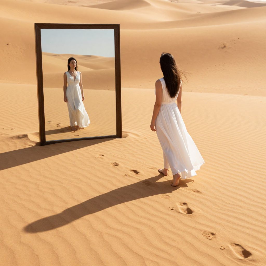 Woman in a flowing white dress stands barefoot in a vast desert, her shadow stretching long against the sand as she gazes into a large mirror that reflects her image walking away, leaving behind a trail of distinct footprints in the golden dunes.