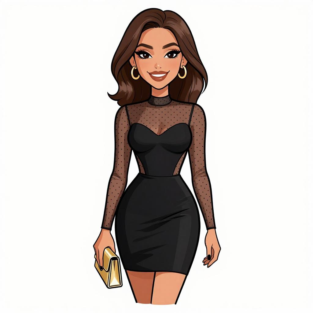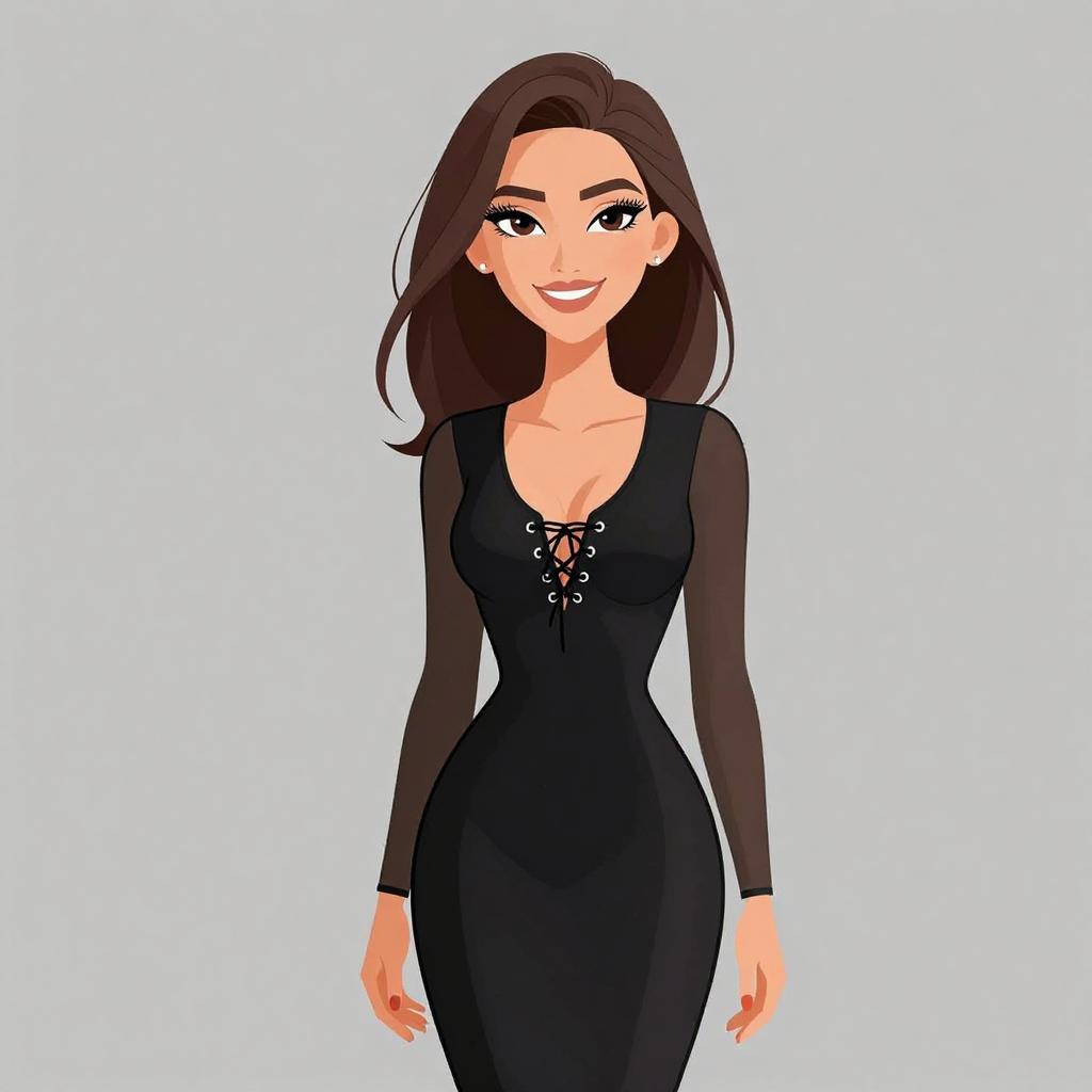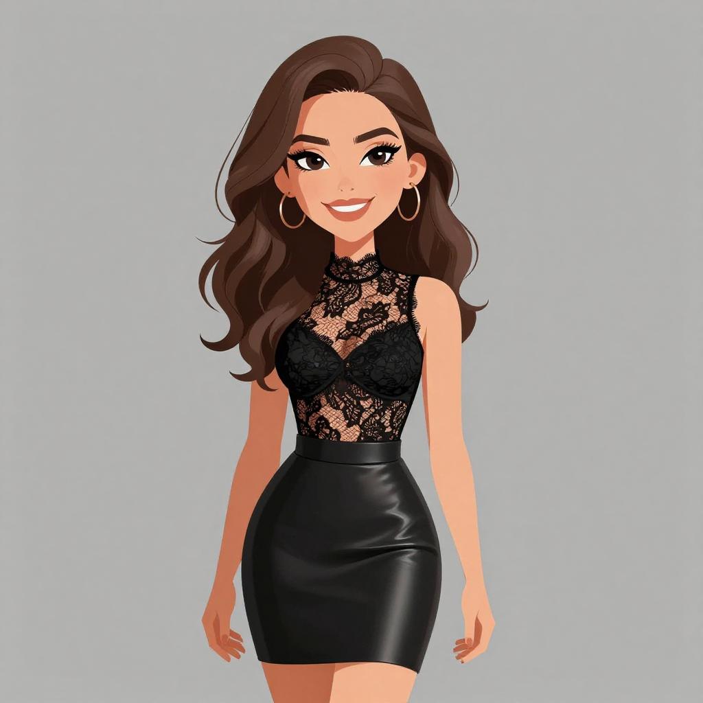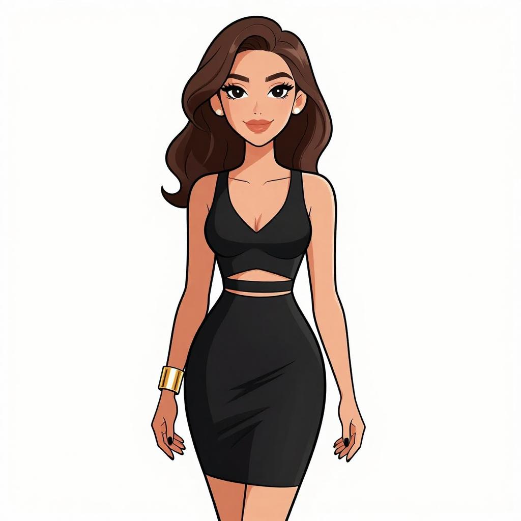 This digital illustration in a cartoon style features a confident woman with long, wavy brown hair and fair skin. She has large, expressive blue eyes, arched eyebrows, and is smiling with red lipstick. She wears a black, sleeveless, V-neck crop top that reveals her midriff and a high-waisted, form-fitting black skirt that reaches her upper thighs. She accessorizes with a gold bracelet on her right wrist and small, gold hoop earrings. The background is plain white, making her the focal point. Her pose is straight and relaxed, with her arms slightly away from her body. The image has bold, clean lines and vibrant colors.