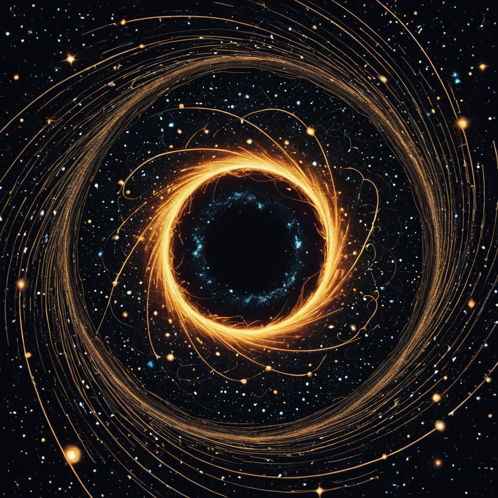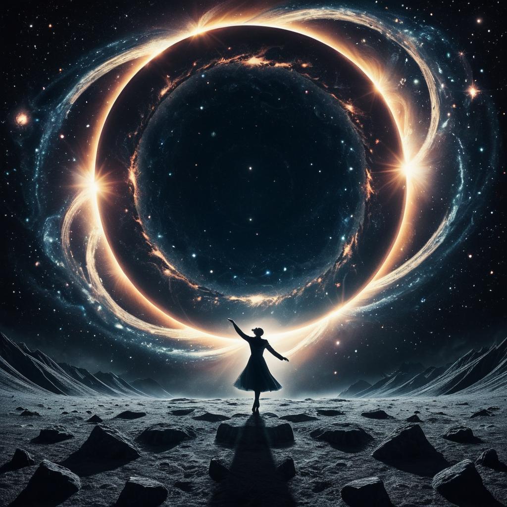 A surreal cosmic landscape featuring a lone figure standing on a rocky terrain beneath a vast starry sky. Central to the image is a glowing, fiery ring representing a black hole surrounded by electric bursts and dynamic light patterns symbolizing a pulsar. The composition highlights the mystical interplay and harmony between cosmic phenomena, with contrasting shadows, electric flares, and radiant light creating a mesmerizing and awe-inspiring scene.