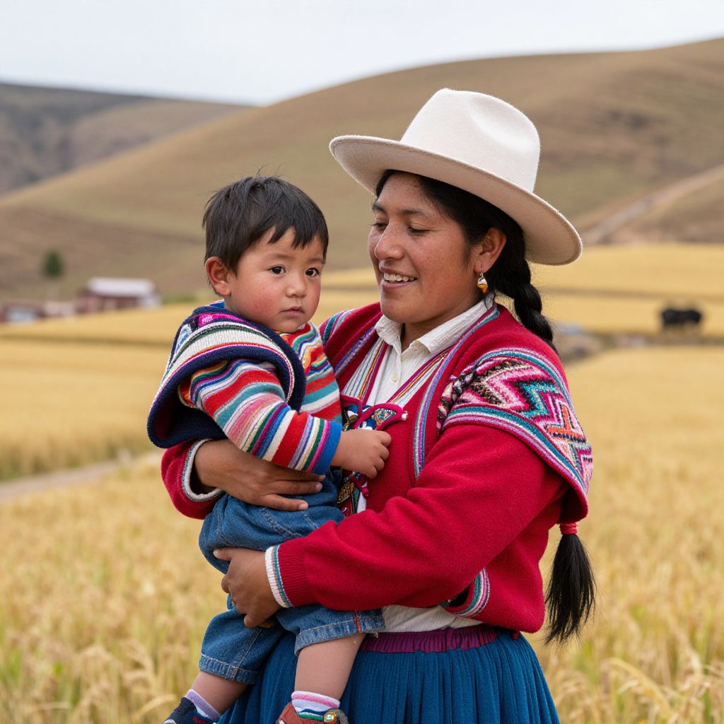 Quechua woman wearing a wide-brimmed hat and vibrant traditional attire holds a child snugly in her arms, both smiling warmly against the backdrop of the Sacred Valley's golden fields and distant hills.