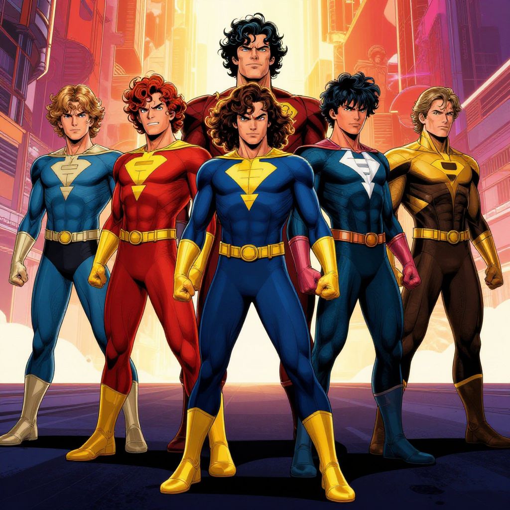 Male superheroes with curly hair assembling for a team photo, diverse costumes, powerful stances, epic background, colorful comic art style
