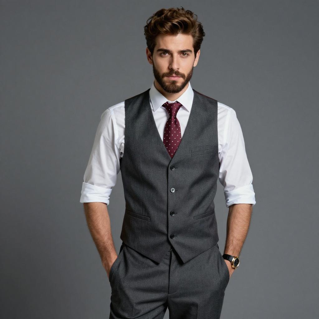 Portrait of a confident young man with brown hair and beard wearing a formal Money Heist inspired costume. He is dressed in a white collared shirt with rolled-up sleeves, a grey vest, dark suit trousers, and a matching dark suit vest. He accessorizes with a maroon necktie with white dots, a black watch on the left wrist, and a black and gold wristwatch on the right wrist. The man stands against a plain grey background with hands in pockets, looking directly at the camera with a serious expression.