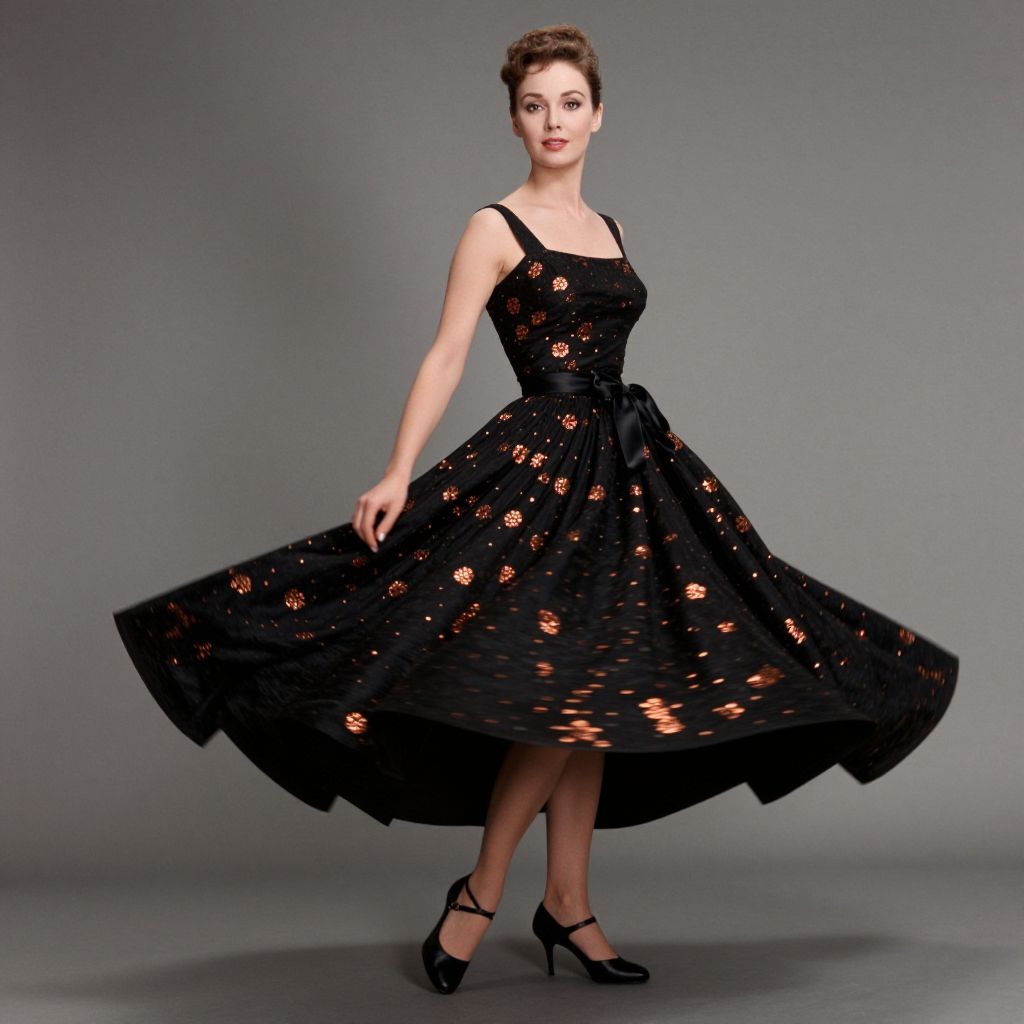Photograph of a young woman with fair skin and short, curly brown hair, wearing a black, sleeveless, full-skirted dress adorned with intricate, semi-transparent orange floral patterns. She stands against a plain gray background, holding out the sides of her dress with her hands, creating a dynamic, circular movement. She wears black, strappy high-heeled shoes. Her expression is confident and poised. The dress's texture appears slightly glossy, and the overall style is reminiscent of vintage 1950s fashion. The lighting is soft, highlighting the dress's details and the subject's features.