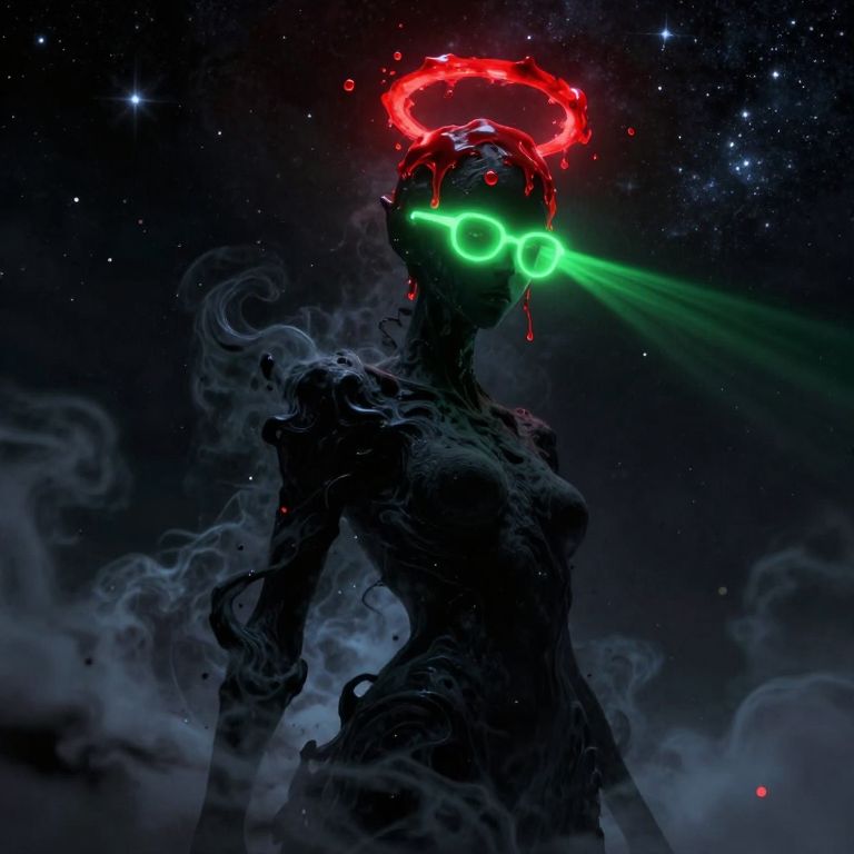 A highly detailed and artistic low-angle illustration of a smoky, black humanoid figure with a swirling, amorphous form, standing in the midst of a starry, cosmic void, Its head is crowned with a melting, bloody-red halo that drips ethereal liquid, dissipating into the surrounding stardust, Neon green glasses hover on its indistinct face, glowing vibrantly and refracting streaks of neon light into the dark atmosphere, Surrounding it are shimmering particles of stardust, streaks of distant galaxies, and soft nebulous clouds that enhance the surreal quality, The interplay of the stark halo, neon green glasses, and the cosmic environment creates an otherworldly, cinematic visual with a hauntingly ethereal allure, epic surreal fantasy style