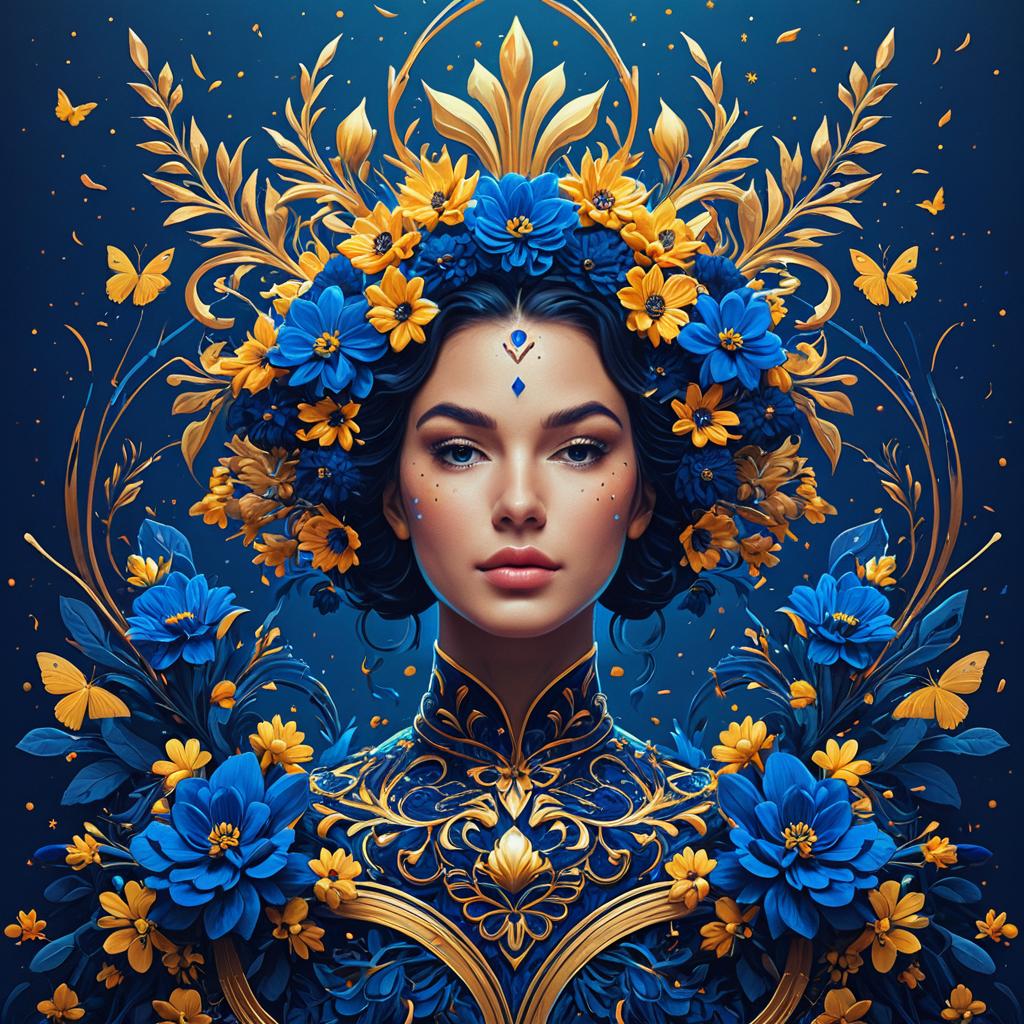 Hyper-realistic digital artwork of a regal woman adorned with a vibrant floral crown featuring royal blue and gold flowers. The intricate design includes butterflies and elegant gold accents surrounding her, set against a matching blue background. The composition combines abstract elements and detailed floral motifs, evoking a majestic and cinematic atmosphere.