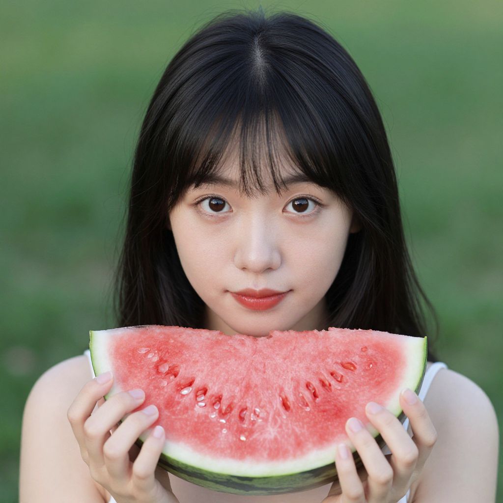 Photograph of an East Asian woman with long black hair and bangs, holding a large, juicy slice of watermelon in front of her mouth. She has fair skin, dark eyes, and red lipstick, gazing directly at the camera. The watermelon slice is vibrant red with black seeds and a green rind. She is wearing a light-colored top, and the background is a blurred green grassy field, indicating an outdoor setting. The image has a slightly surreal, enhanced color effect.