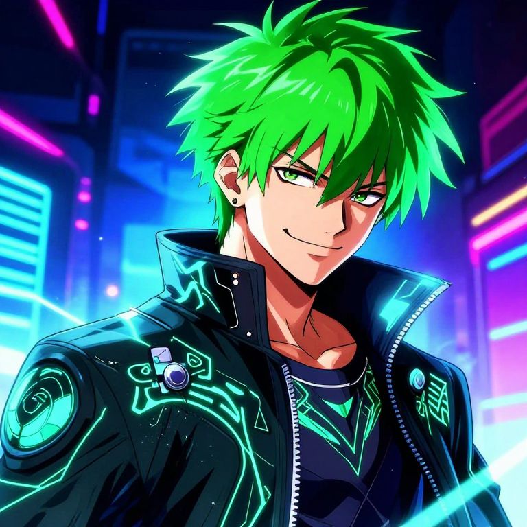 Green hair anime guy with spiky hair style, cyberpunk themed environment, neon-lit background, intricate jacket with glowing patterns, vibrant colors and sharp linework, confident smirk, dramatic perspective, high contrast shadows and electric energy vibe.