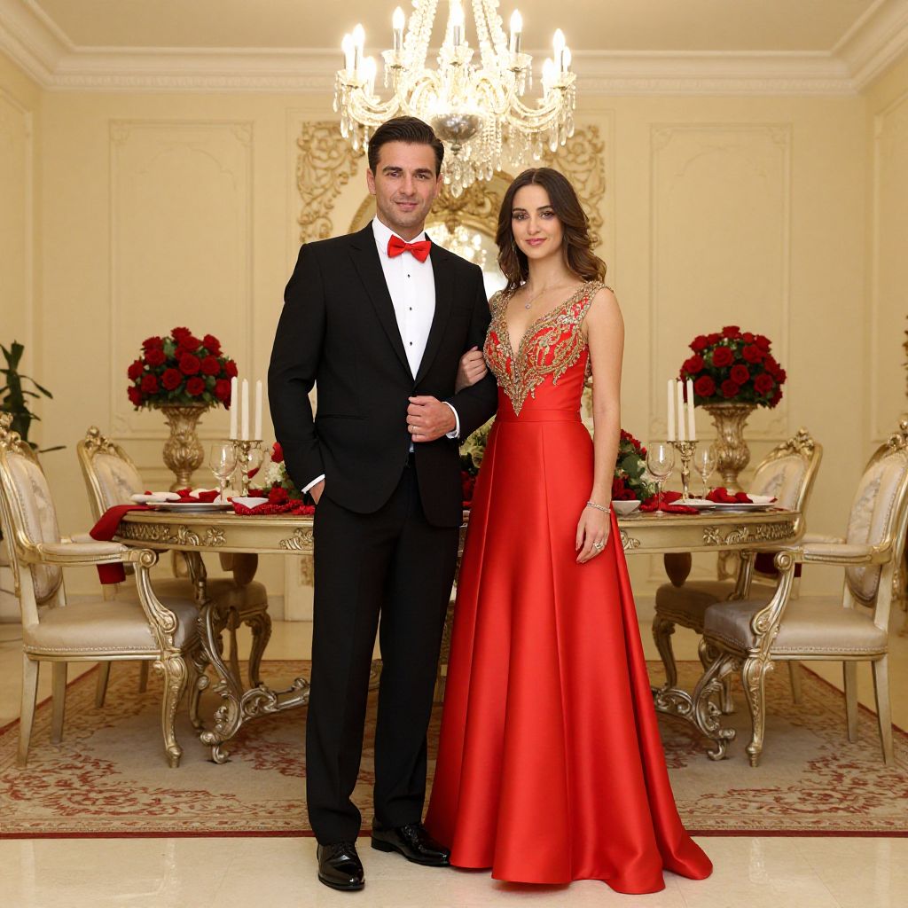 Elegantly dressed couple stands amidst a luxurious setting, featuring a man in a classic black tuxedo with a red bow tie and a woman in a vibrant red gown adorned with gold embellishments, surrounded by opulent decor including a grand chandelier, ornate furniture, and festive red rose arrangements on tables set for a celebratory occasion.