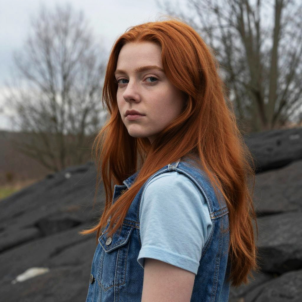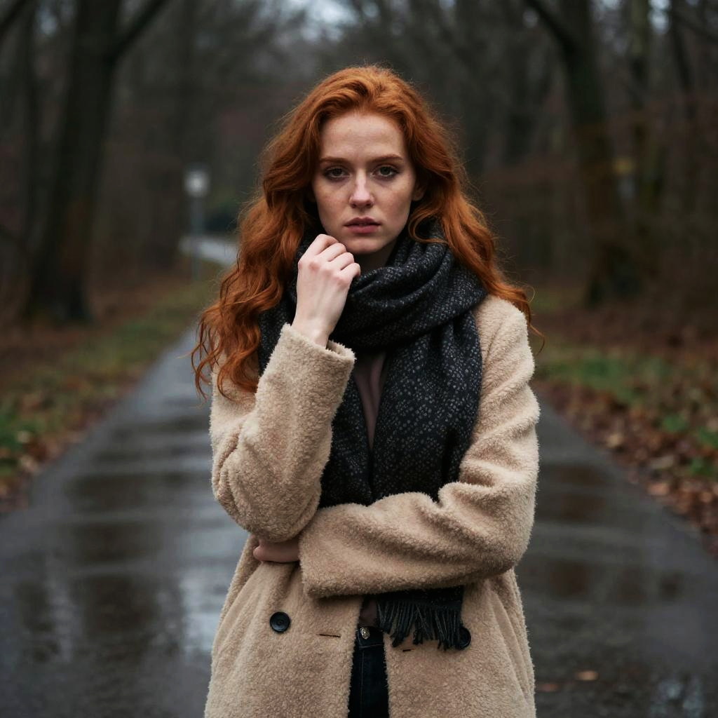 Photograph of a young woman with long, wavy red hair standing in a dark, forested park at dusk. She's wearing a dark, textured coat with a high collar and has a serious expression. The background is dimly lit with trees and a bench on the left. The overall mood is mysterious and slightly eerie.