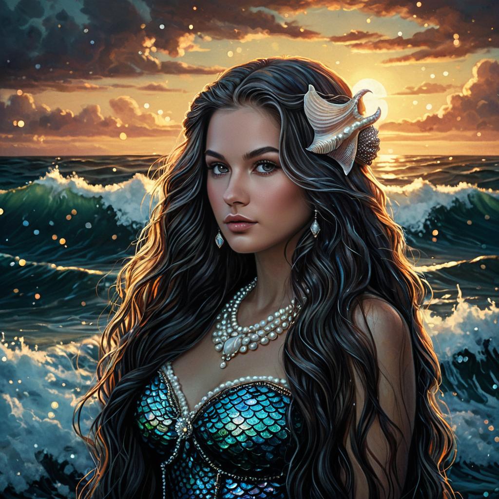 A highly detailed digital painting of an enchanted mermaid with long flowing dark hair adorned with seashells and pearls. She wears an iridescent scale top and pearl jewelry. The background features ocean waves at sunset with sparkling lights, creating a soft yet gothic and romantic atmosphere.