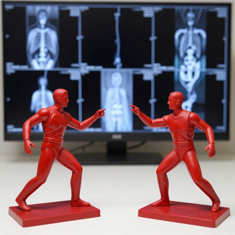 Photograph of two red, human-shaped, articulated action figure statues standing on rectangular bases, facing each other with arms raised in a boxing stance. In the background, a large screen displays a black and white X-ray-like image of a human torso, divided into grid segments. The statues are highly detailed, with visible muscle definition and a smooth, glossy finish. The screen's images are slightly blurred, emphasizing the foreground figures. The overall scene has a futuristic, medical-themed aesthetic.