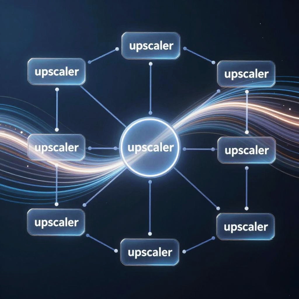 Digital graphic of six "Upscaler" text boxes connected by lines to a central blue circle, set against a dark blue background with white and blue light