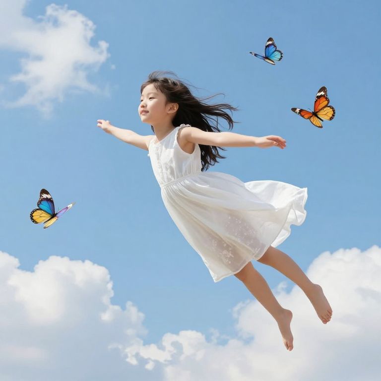 A young girl in a flowing white dress soars joyfully through a vibrant sky, surrounded by fluffy white clouds and four colorful butterflies fluttering gracefully around her.