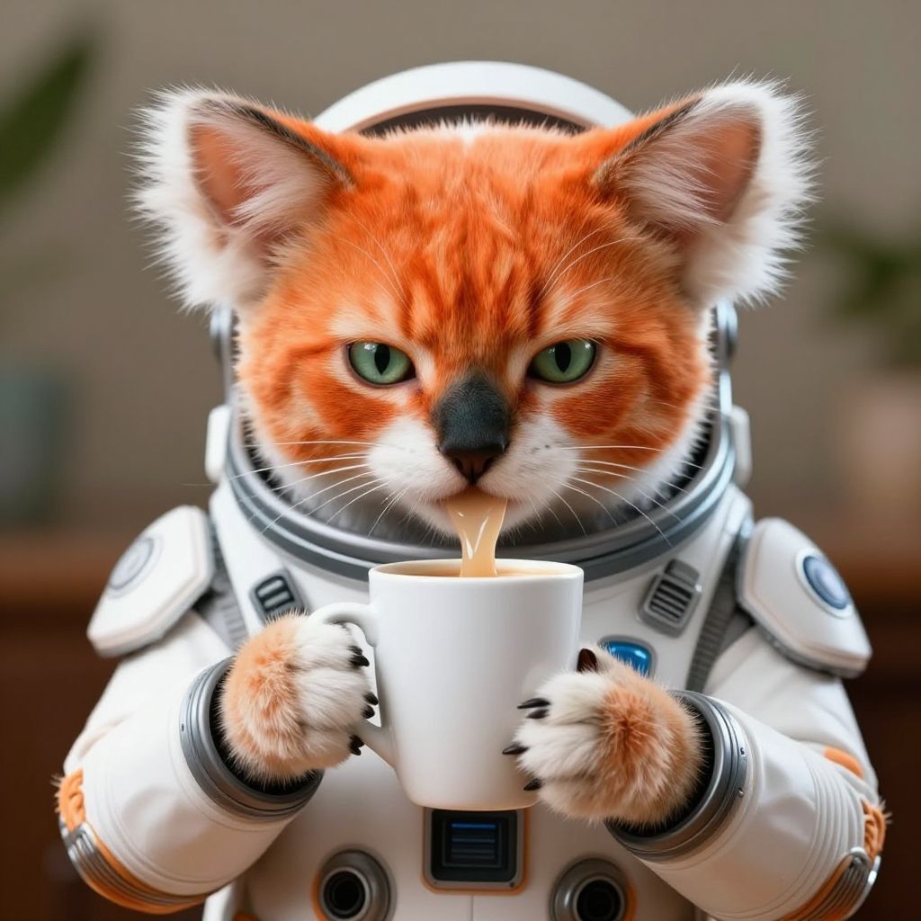 Digital artwork of a cute orange tabby kitten wearing a white astronaut helmet and suit, drinking from a white cup.