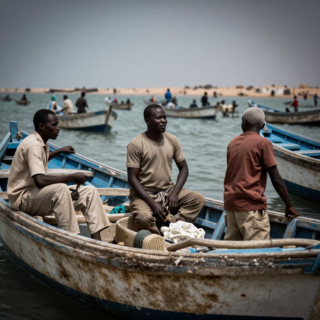 Cinematic film still Mauritania fishing boats out on the water, Mauritania fisherman, documentary photography, capturing reality, social issues, human experiences, photojournalistic storytelling, candid moments, authentic narratives, raising awareness, documenting history, preserving cultural heritage, immersive storytelling, evoking empathy, powerful imagery, journalistic integrity . shallow depth of field, vignette, highly detailed, high budget, bokeh, cinemascope, moody, epic, gorgeous, film grain, grainy