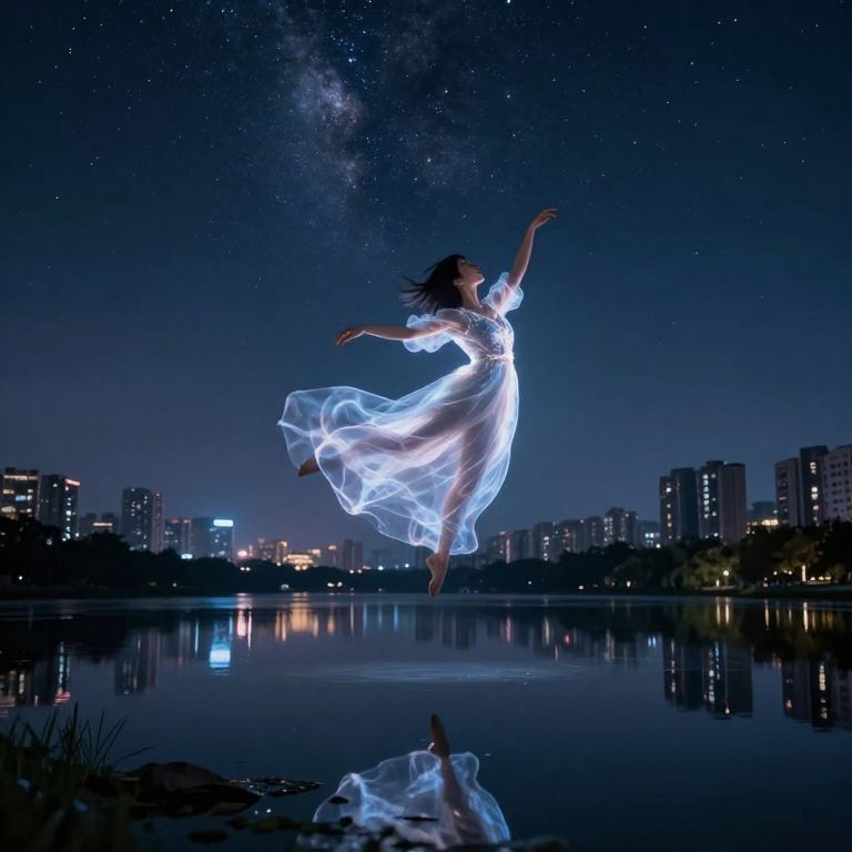 Photograph of a woman mid-jump against a night sky filled with stars and the Milky Way. She wears a sheer, flowing white dress that glows in the darkness. Her arms are outstretched, and her hair flows behind her. She jumps over a calm, reflective lake, with her reflection visible on the water's surface. The city skyline with illuminated buildings is in the background, adding a modern contrast to the natural and cosmic elements. The image combines elements of surrealism and ethereal beauty, highlighting the intersection of human movement and the vastness of the universe.