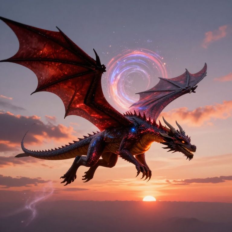 Digital illustration of a dark, red-scaled dragon with glowing blue eyes and large wings, flying against a vibrant sunset sky with a glowing, circular aura