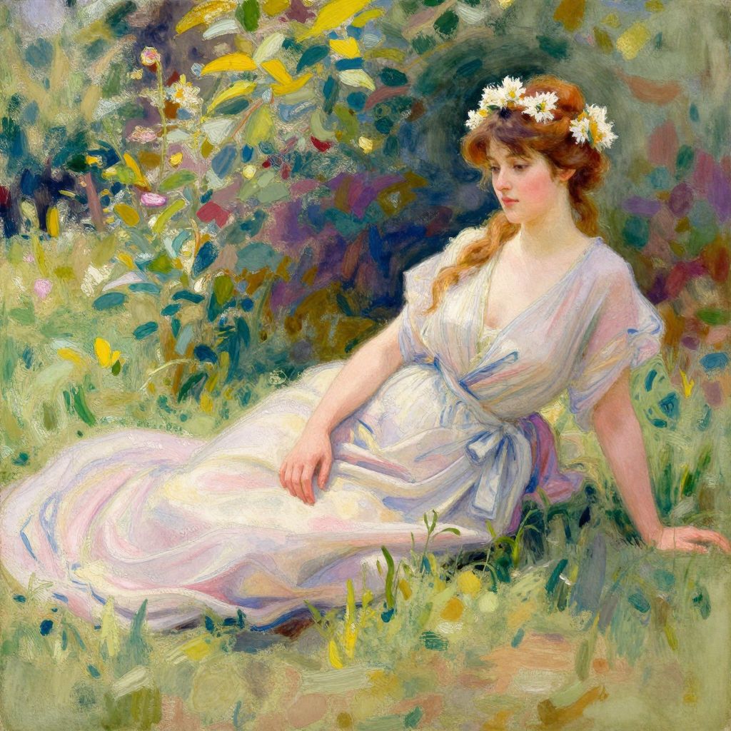 Impressionist painting of a fair-skinned, red-haired woman in a white dress and daisy crown, sitting in a colorful, lush garden.