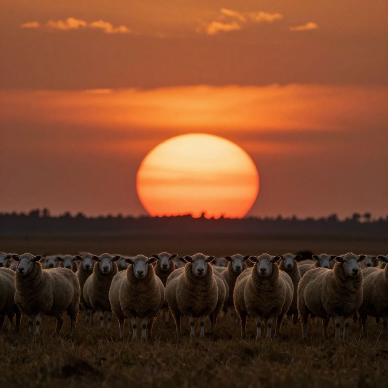 Golden sheep stand in a vast field as a massive, fiery sun descends behind them, casting an orange glow over the horizon and silhouetting the flock against the darkening sky.