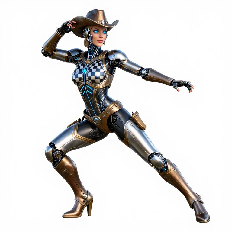 Digital CGI image of a female robot in a dynamic pose. The robot has a sleek, metallic body with a checkered pattern on the chest, resembling a cowboy theme. She wears a brown cowboy hat, black gloves, and gold high-heeled boots. Her eyes are blue with a glowing effect, and her joints are visible, adding to her robotic appearance. The background is pure white, making the robot the focal point. The textures are shiny and reflective, highlighting her metallic components. She strikes a confident, action-ready stance, with one hand on her hat and the other extended forward.