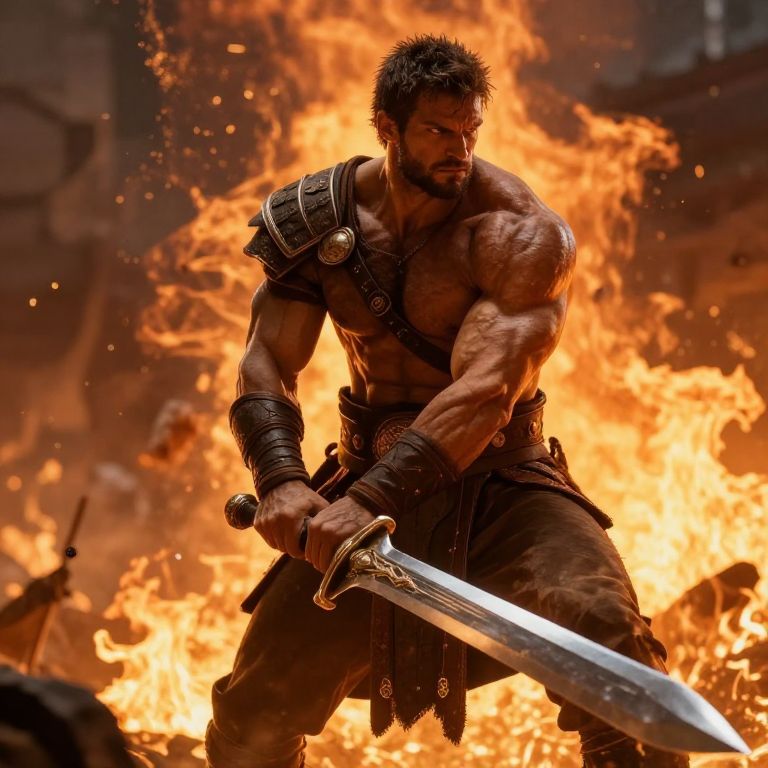 Muscular warrior in ancient armor holding a massive sword, fiery battlefield background, epic fantasy scene with detailed musculature and dramatic flames illuminating the figure.