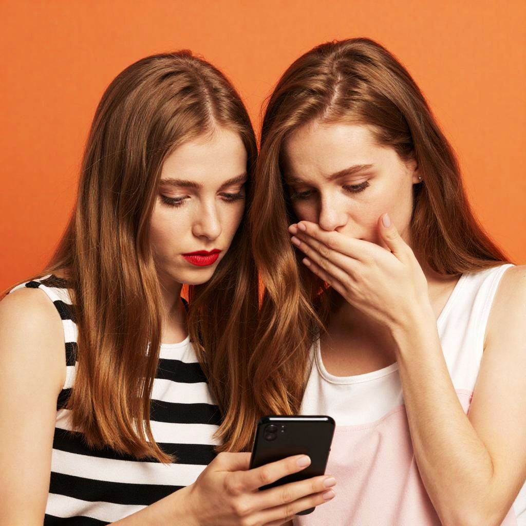 Photograph of two young Caucasian women with long brown hair, standing close against a vibrant orange background. The woman on the left wears a black and white striped sleeveless top and looks at a black smartphone with red lipstick. The woman on the right, in a white sleeveless top, covers her mouth with her hand, appearing surprised or embarrassed. Both women have light skin and focused expressions. The image has a bright, high-contrast style, emphasizing their expressions and the orange background.