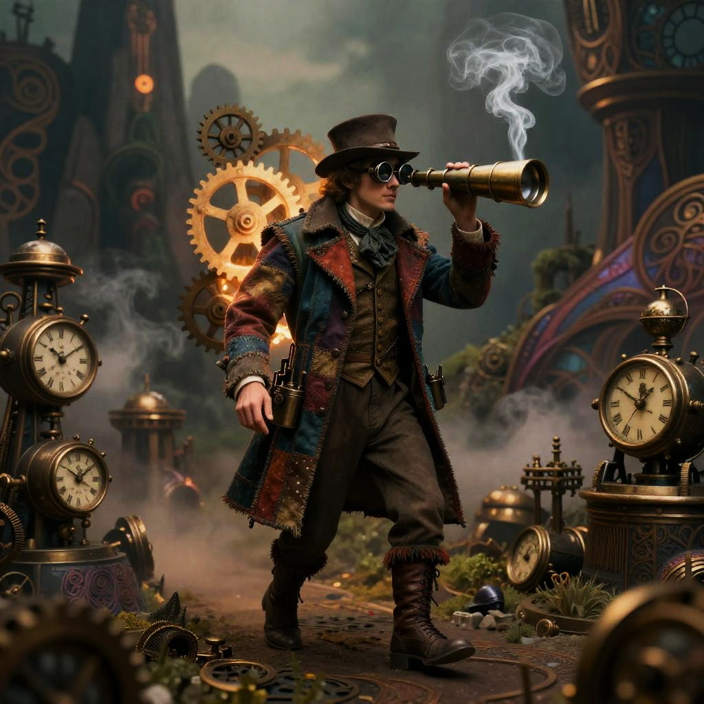 Realistic photo.Steampunk psychedelic artstyle, a whimsical inventor with goggles and a top hat walking with a brass telescope, surrounded by floating cogs and shimmering orbs. Set against a surreal mountainous terrain with intricate gears, maps, and clocks. The scene is illuminated by ambient glowing light, adding atmospheric depth and a whimsical, mysterious vibe. Rendered in rich earthy tones with vibrant, contrasting colors and vintage textures, ultra-detailed in HD quality. Captures the essence of The Hermit, blending mysticism with intricate steampunk details. realistic photo