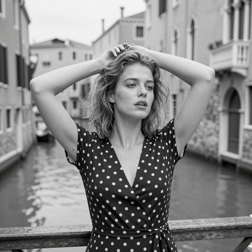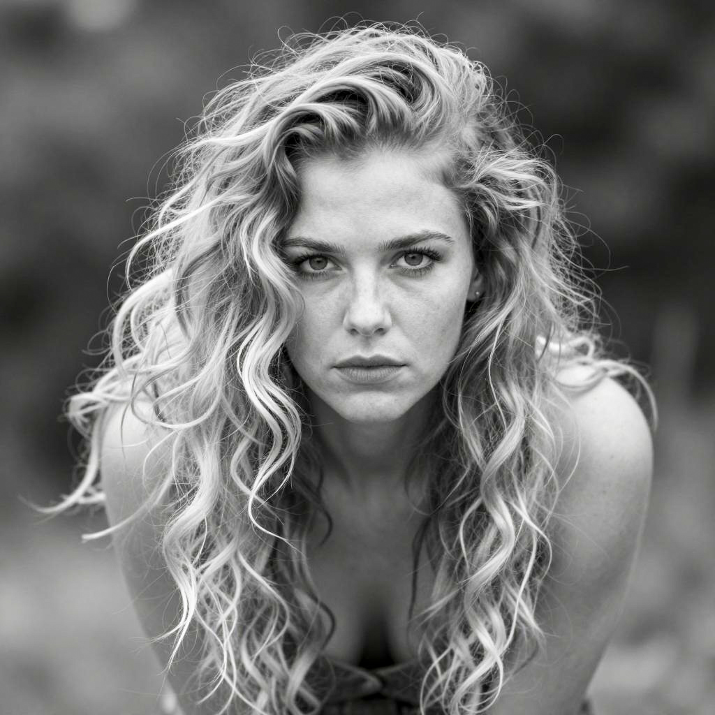Black and white photograph of a woman with wavy hair leaning on a Vespa scooter. She has light skin, intense gaze, and a slight smile. Her arms rest on the handlebars, hands clasped. The Vespa's round headlight is centered. The background is blurred.