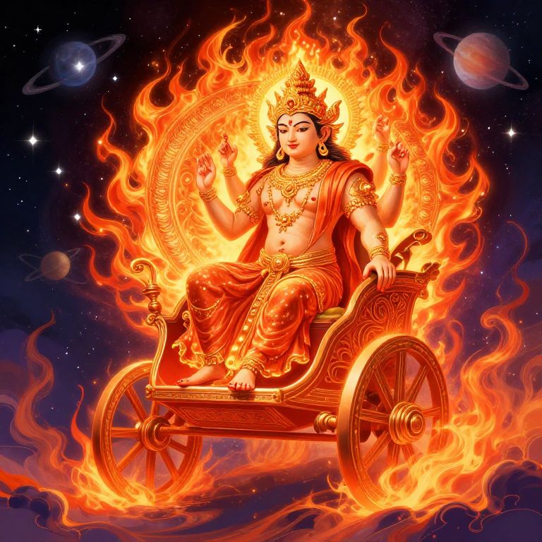 A dynamic portrait of Surya surrounded by swirling flames and celestial energy, seated on a chariot in a cosmic scene with stars and planets, rendered with vivid colors and intricate glowing patterns.
