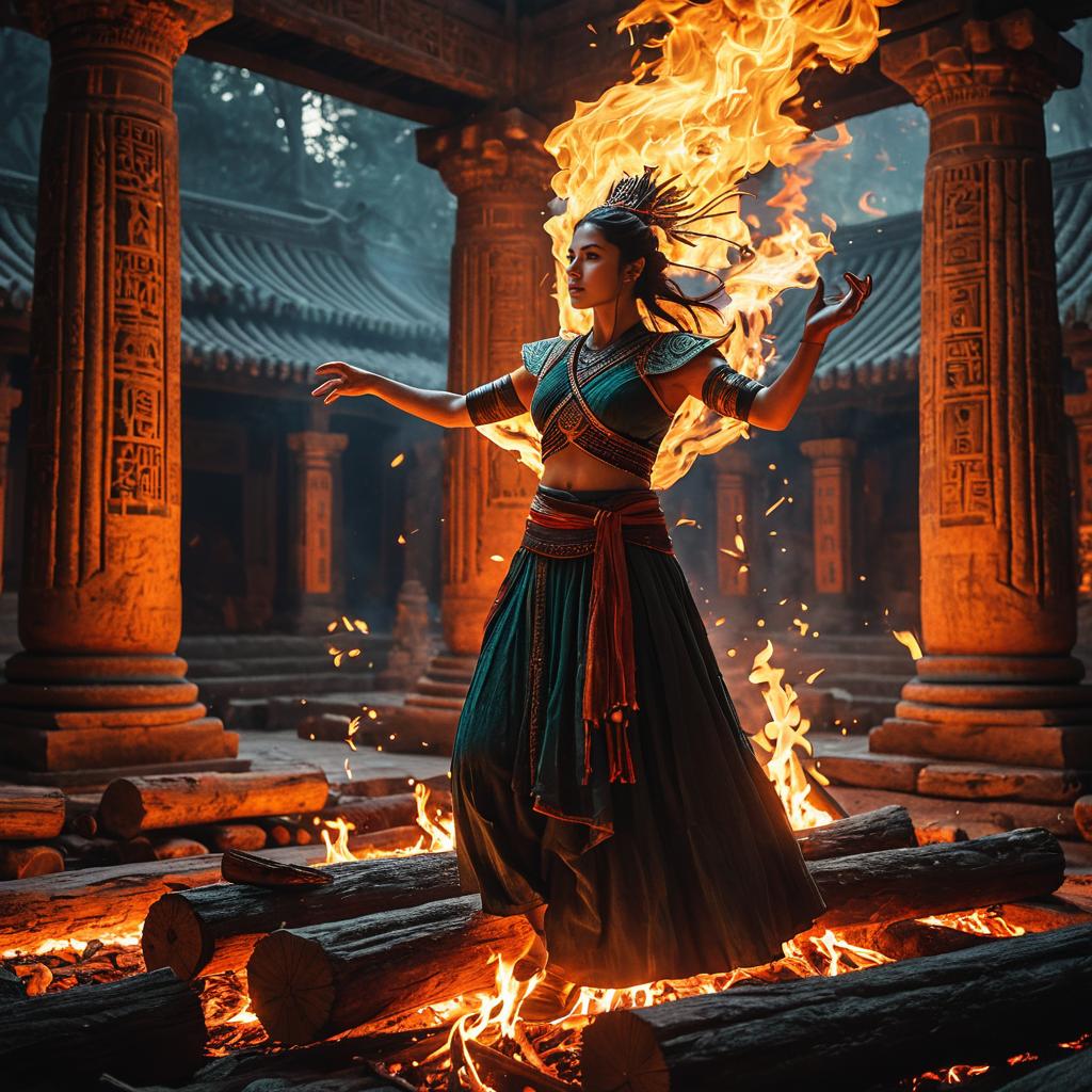 (Inside an enchanted forest), a fire djinn dances gracefully atop the burning logs. Rendered in a fantasy style, the scene glows with a warm color scheme, as embers illuminate the surroundings, creating an ethereal ambiance. Flickering shadows and intricate flames convey fluid motion, capturing a high level of detail in 4K resolution. The cinematic atmosphere is enhanced by soft light casting a magical glow, crafting an enchanting and captivating scene that feels alive with warmth and wonder.