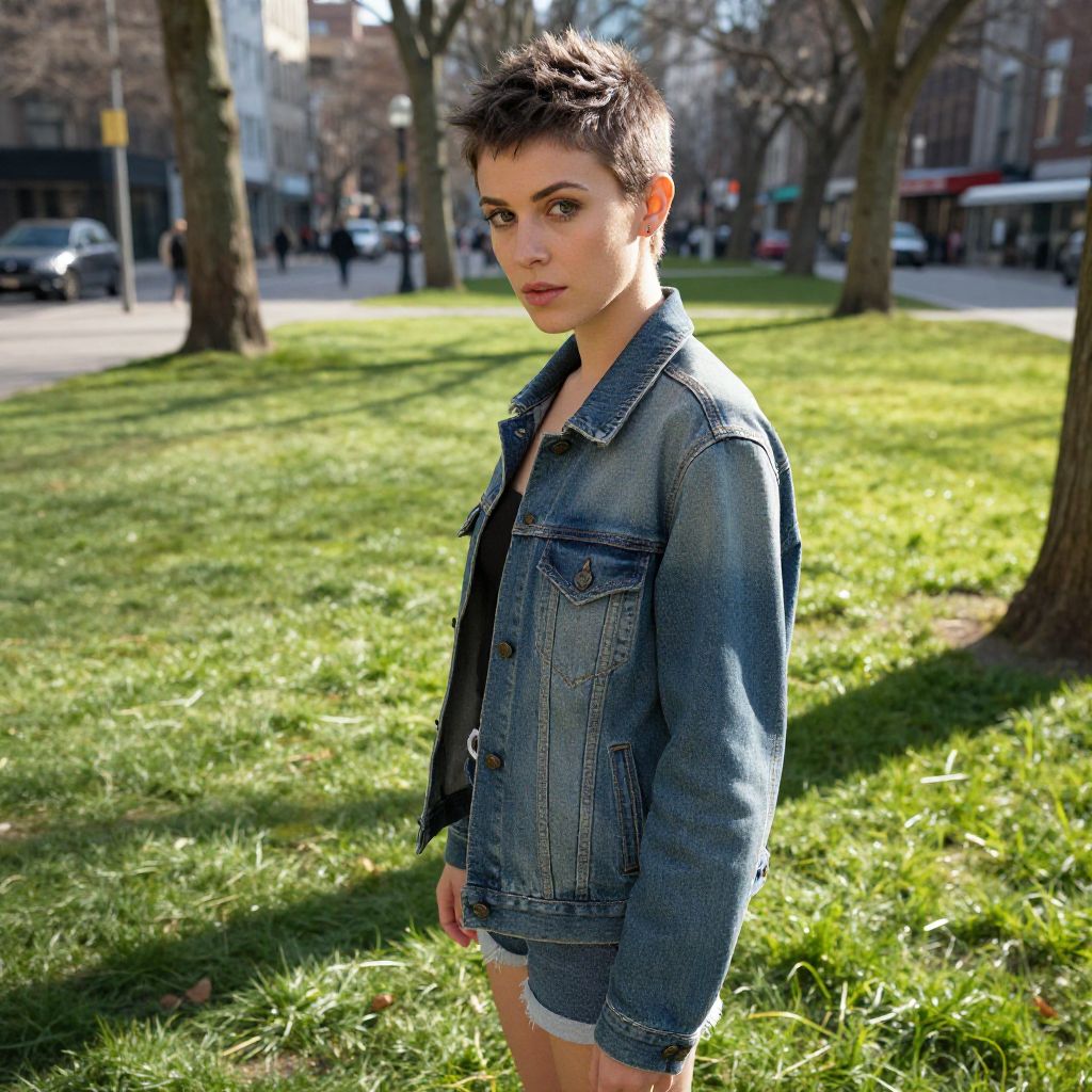 Woman with textured pixie cut hairstyle standing in a sun-drenched urban park, natural sunlight casting long shadows, wearing a vintage denim jacket and barefoot, vibrant green grass beneath her, expressive eyes, detailed hair texture, cinematic lighting, realism style.