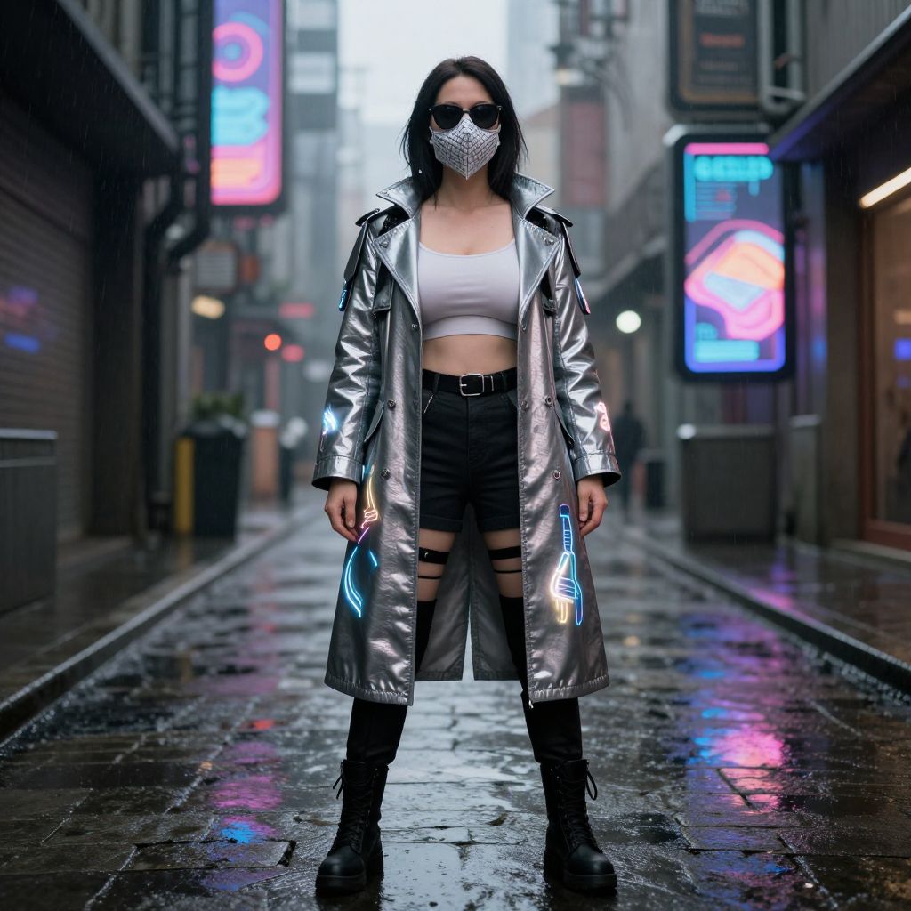 Cyberpunk street scene: woman in silver metallic coat, white crop top, black shorts, face mask, black boots, standing on wet, neon