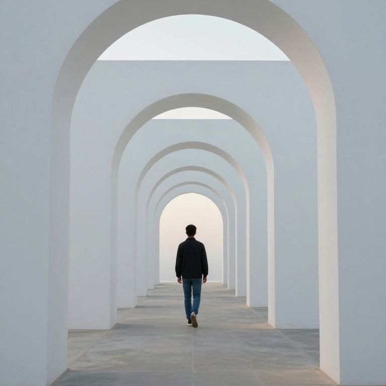 A solitary figure traverses an endless corridor of white archways under a serene sky, embodying the quiet introspection of a journey through infinite possibilities and the weight of choices yet to be made.