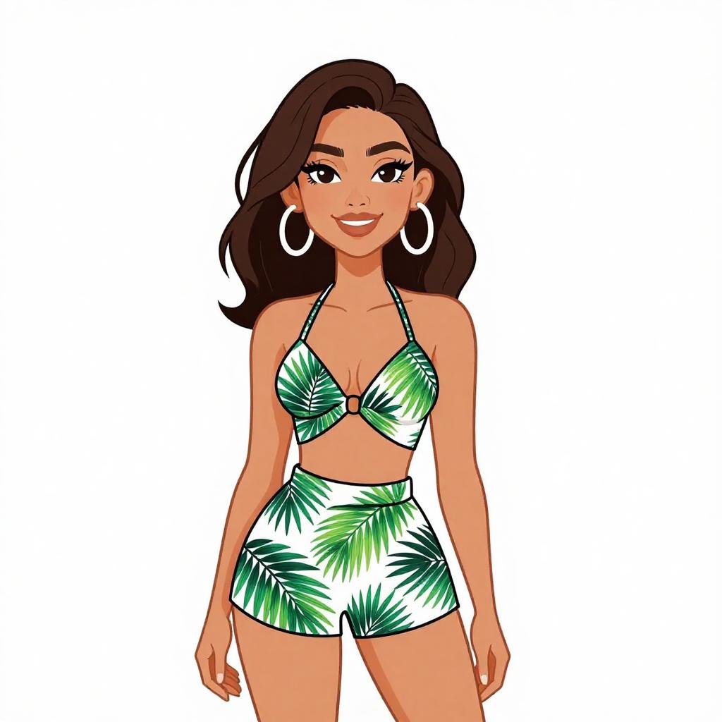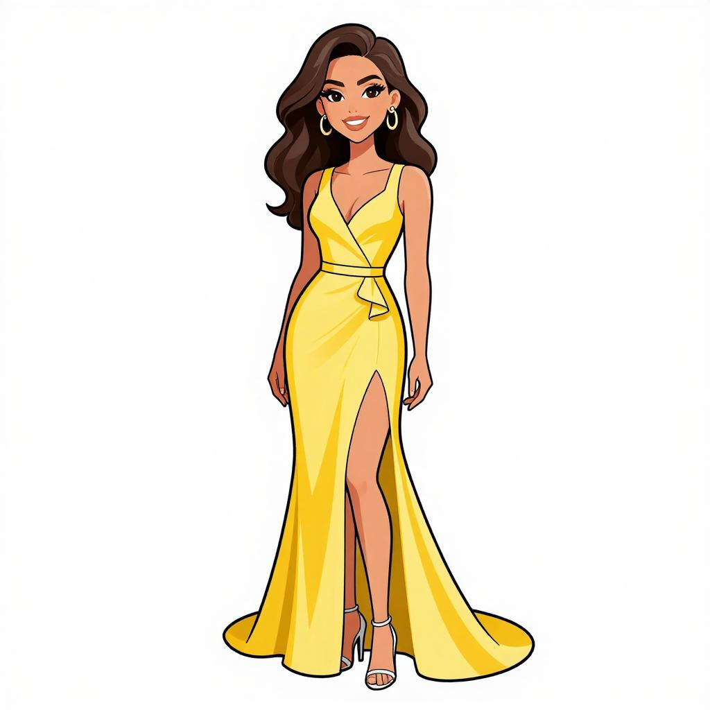 Woman with pretty face and pretty hair. smiling Woman, tropical resort, halter neck maxi dress in vibrant teal with yellow and white feather-like patterns, sleeveless, keyhole cutout at chest, thigh-high slit, cinched waist with tie belt, strappy flat sandals, simple metallic watch, white background. --sref 1467