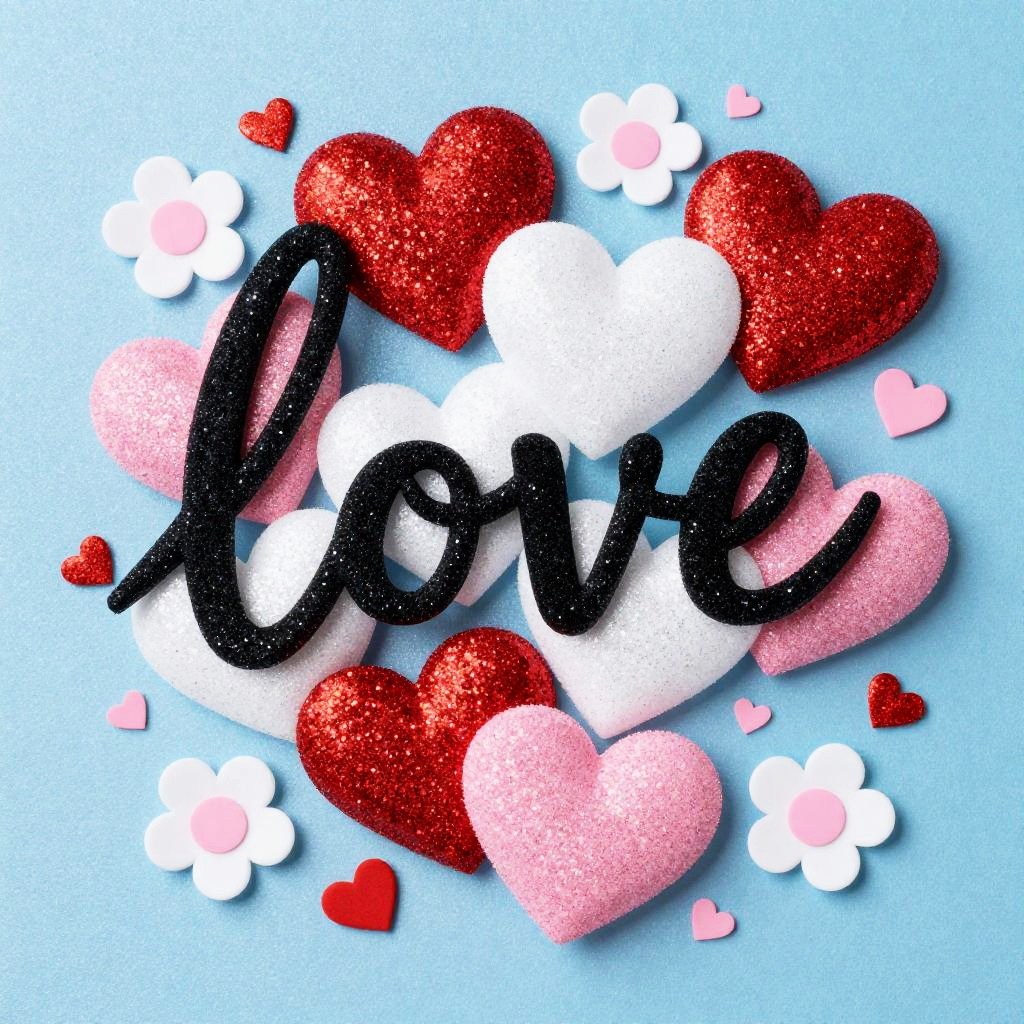 This digital artwork features a vertical arrangement of textured, glittery hearts in red, white, and pink. The word "love" is written in black, cursive, glittery font, partially overlapping the hearts. White flowers with pink centers and small red and pink hearts are scattered around, set against a sparkly, light blue background. The overall style is playful and romantic.