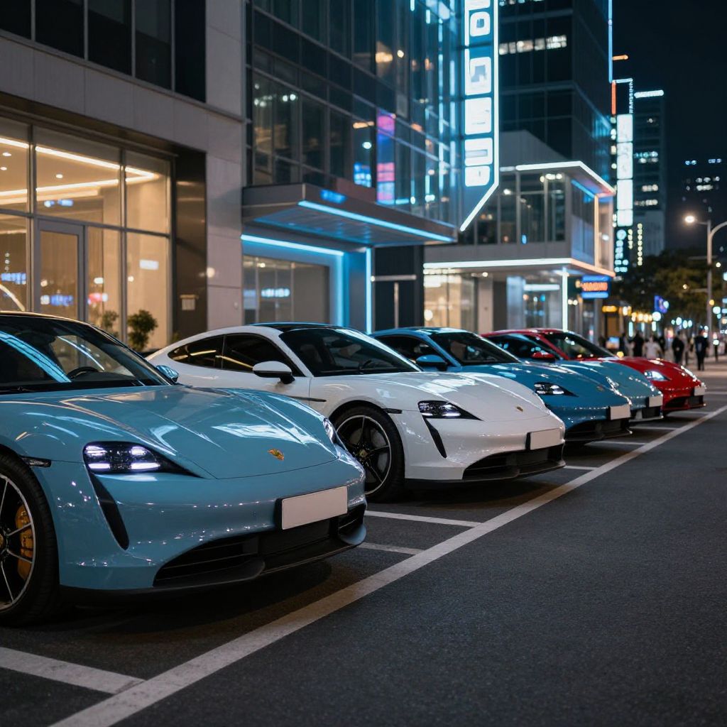 Photograph of a nighttime urban street scene featuring a row of luxury sports cars parked in parallel along the curb. The cars, from left to right, include a light blue Porsche, a white Porsche, a blue Porsche, and a red sports car. The buildings in the background are modern with illuminated signs and large windows, reflecting neon lights in blue and white. The street is dark with visible white parking lines. The cars are shiny and well-maintained, with sleek, aerodynamic designs. The overall scene exudes a sense of urban luxury and modernity.