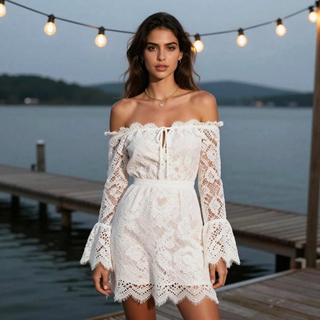 A woman in a madhouse visual style, wearing a sleeveless white lace top and a mint green skater skirt, stands at a sunset photography spot in the forest, surrounded by trees and soft golden light. Sexy. Pretty face and beutiful eyes