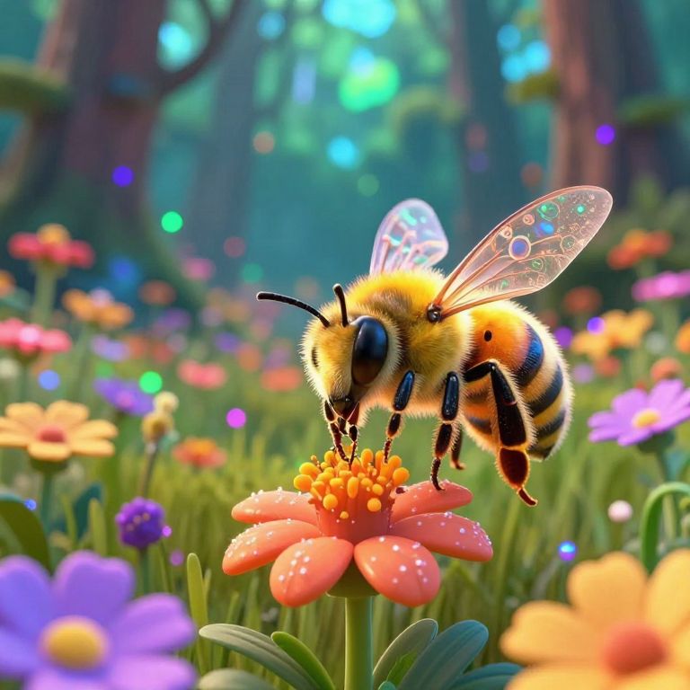 A vibrant 3D-rendered scene depicts a bee pollinating a field of neon-lit digital flowers, blending natural beauty with futuristic cyberpunk aesthetics in a high-definition, immersive forest setting.