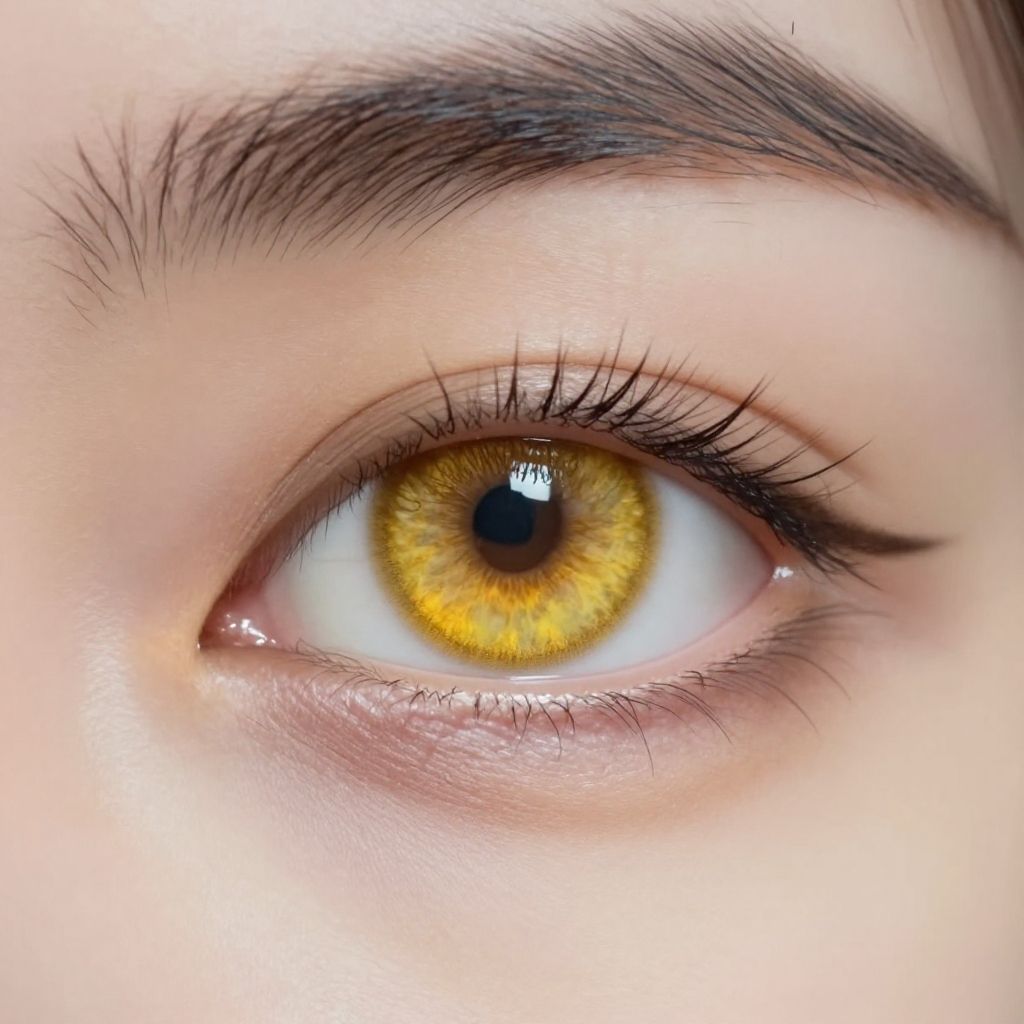 Close-up photograph of a light-skinned person's eye with a striking yellow iris, detailed pupil, and thick, dark eyebrows.