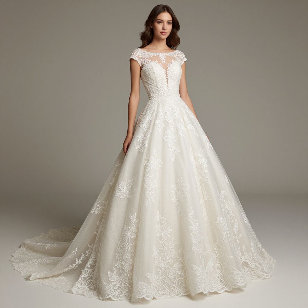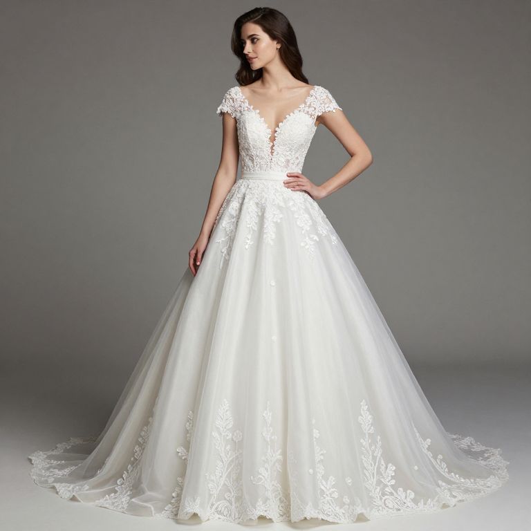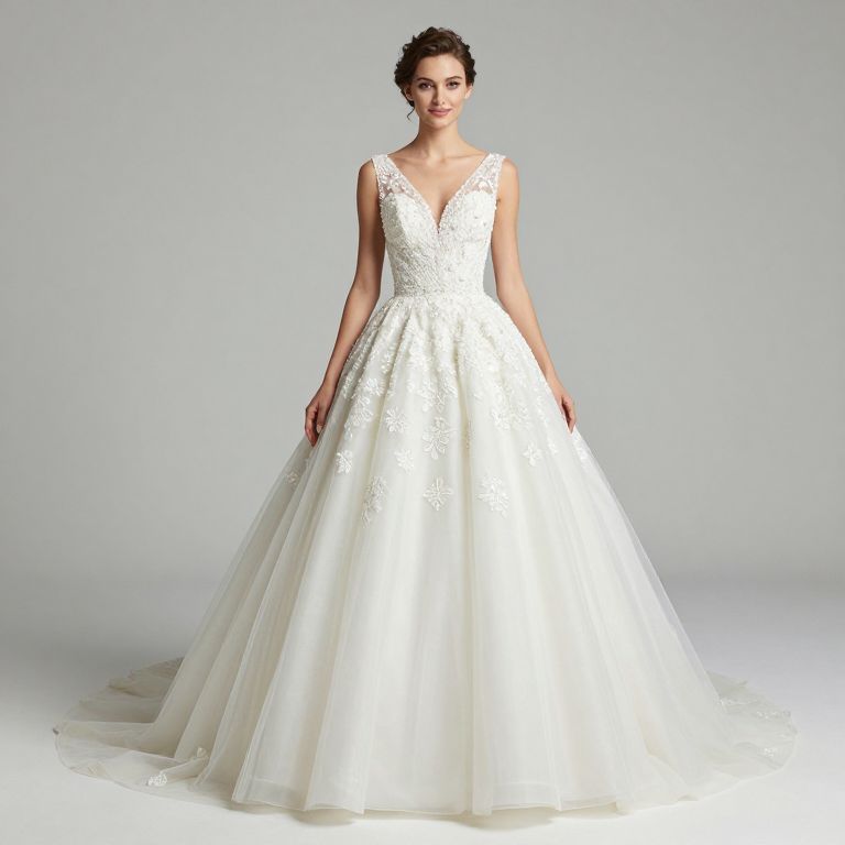 Photograph of a beautiful woman in a white, lace-embellished, sleeveless ball gown with a full, flowing skirt, standing against a