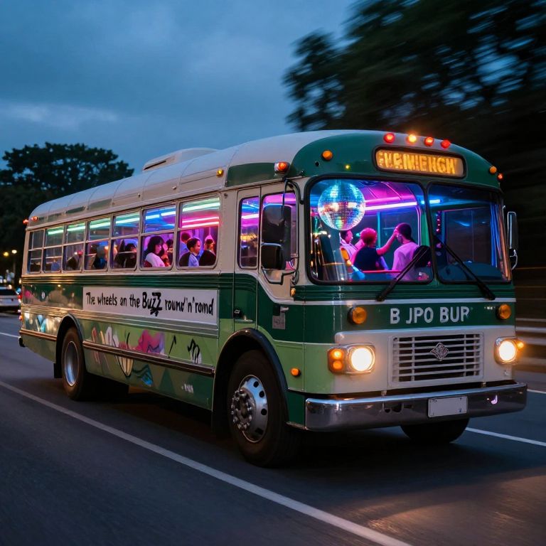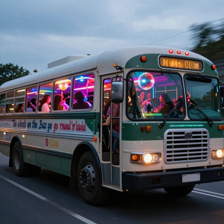 An old bus converted to a disco full of partying people is driving on the road, It has a disco ball inside and there's a lot of neon lighting underneath, On the side of the is spraypainted \"The wheels on the Buzz go round'n'round\