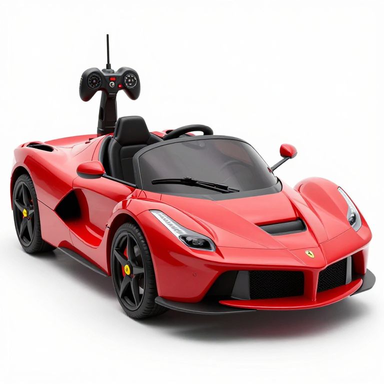 A sleek, high-definition 3D-rendered depiction of a Ferrari LaFerrari-inspired kids' ride-on car in vibrant Ferrari red, featuring remote control functionality and detailed design elements, showcasing a modern and realistic visual style.