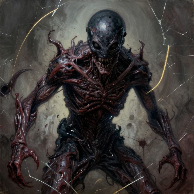 Digital painting of a menacing, black, alien creature with a glossy, elongated skull, twisted, muscular body, and glowing yellow energy trails, set