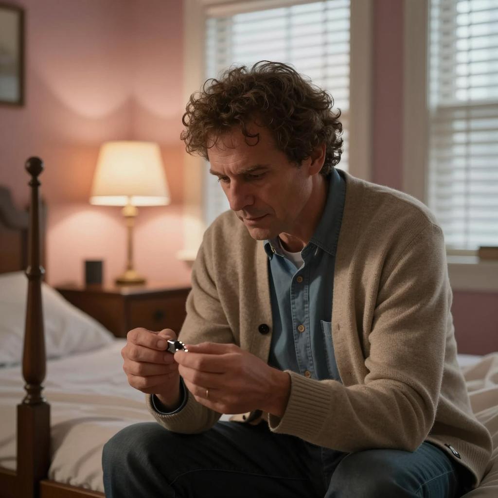 Middle-aged man with curly brown hair, wearing a beige cardigan and blue shirt, sits on a bed, examining a small object in his hands. Lamp with a beige shade on a wooden nightstand is in the background. Dark wooden bedpost in the foreground. Dimly lit room with pink walls. Two windows with blinds on the right. Man's expression is focused.