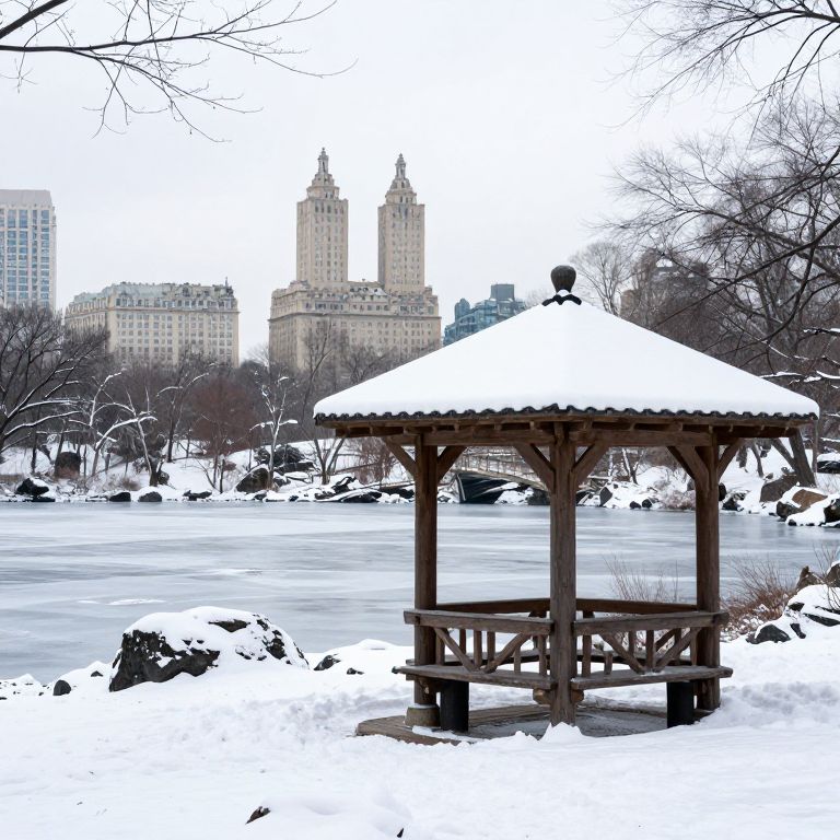 Wagner Cove wooden shelter on a winter snow day in central park from a viewpoint over frozen lake
